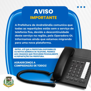 A Prefeitura de Andrelândia comunica que todas as repartições estão sem o serviço de telefonia fixa, devido a descontinuidade deste serviço na região, pela Operadora OI.