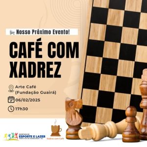 Nessa quinta-feira (06/02), a partir das 17h30, no Café Arte (Fundação Guairá), acontecerá o evento Café com Xadrez , uma oportunidade para amantes do jogo e curiosos se reunirem em um ambiente descontraído.