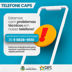 TELEFONE – CAPS Autor do post:Assessoria de Comunicação Post publicado:julho 24, 2024 Categoria do post:Notícias Devido a problemas técnicos, o telefone fixo do CAPS de Andrelândia não está funcionando. Quem precisar entrar em contato, ligar no (35)99838-9551 (WhatsApp). Você também pode gostar PLANO ANUAL DE APLICAÇÃO DOS RECURSOS julho 17, 2024 EDITAL PARA FOMENTO À EXECUÇÃO DE AÇÕES CULTURAIS (APOIO DIRETO A PROJETOS) EDITAL DE CHAMAMENTO PÚBLICO Nº 07/2024 – DEMAIS ÁREAS setembro 4, 2024 45ª Expoagro de Andrelândia Bate Recorde de Produção setembro 18, 2024
